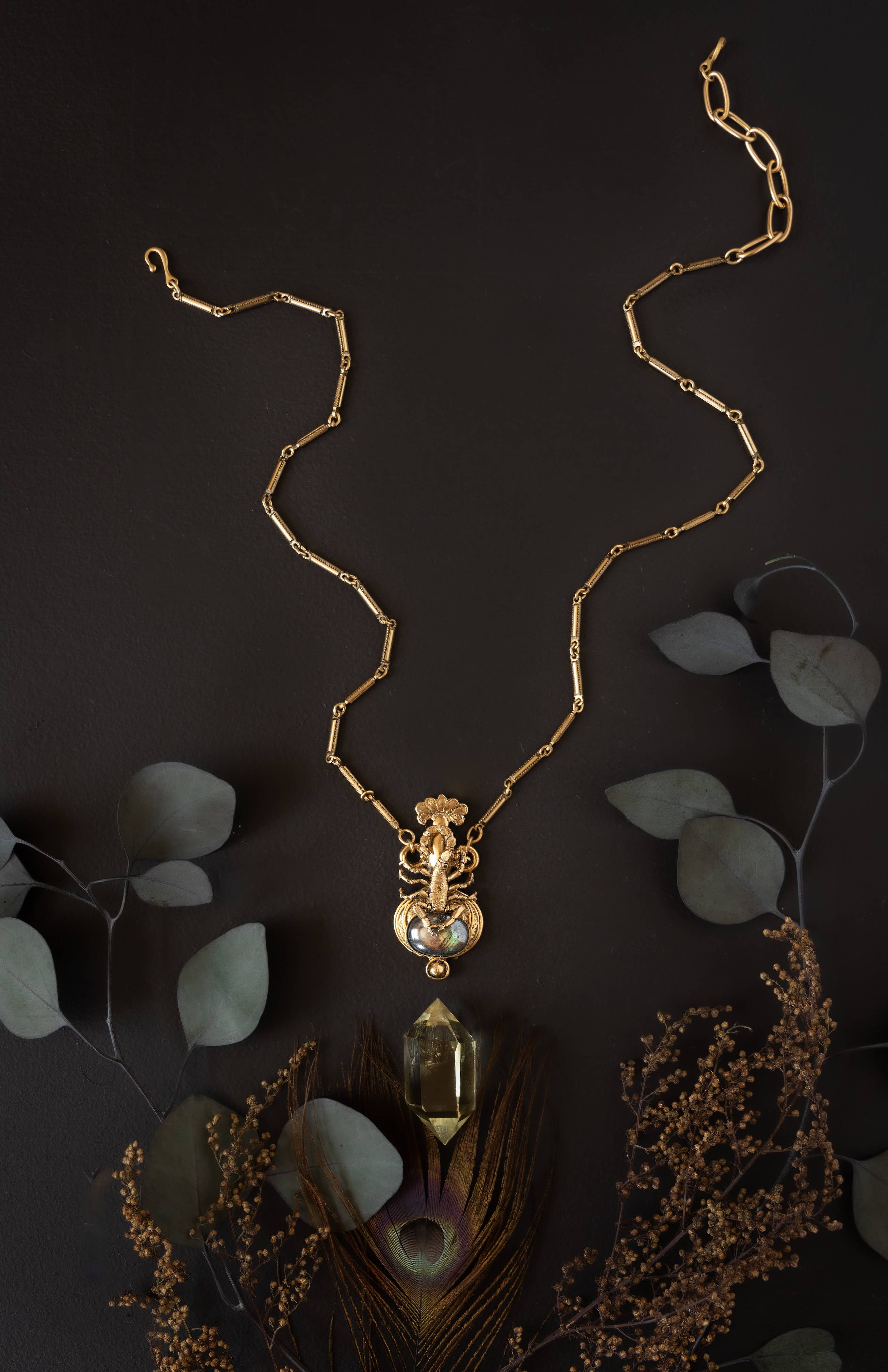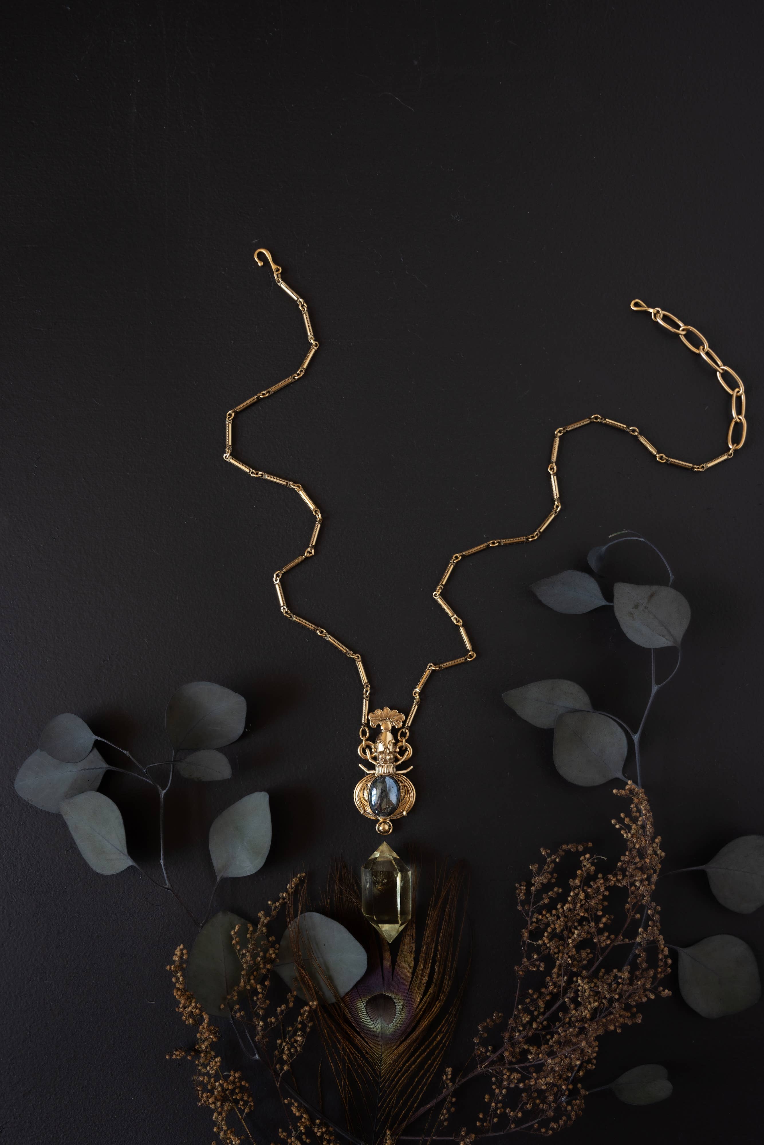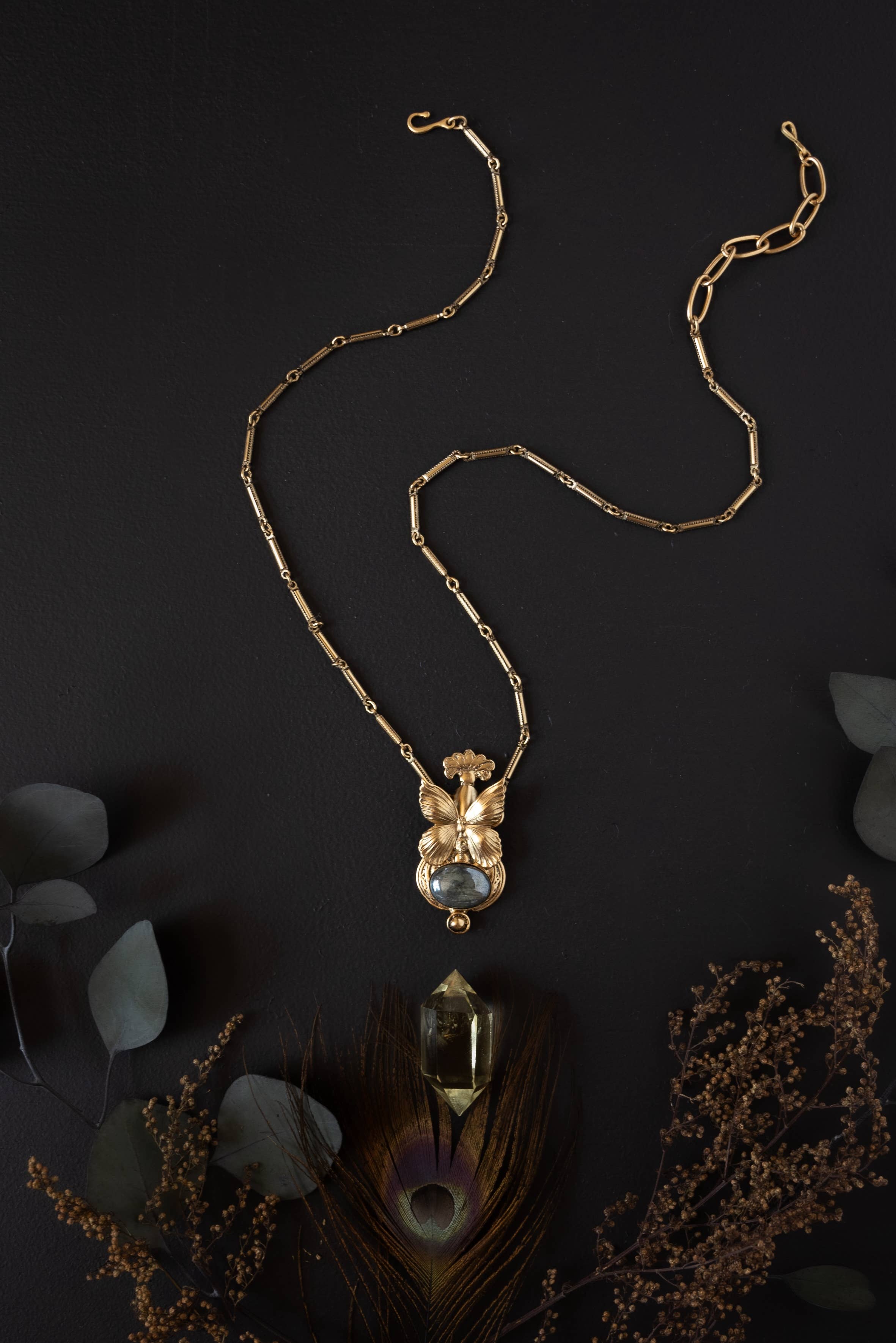 Neckline: 22” with 3” adjuster Pendant, 2.25” -Bronze casting with antique gold overlay -Tooled brass charms with antique gold overlay -Brass chain with antique gold overlay -Gemstone
