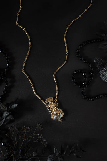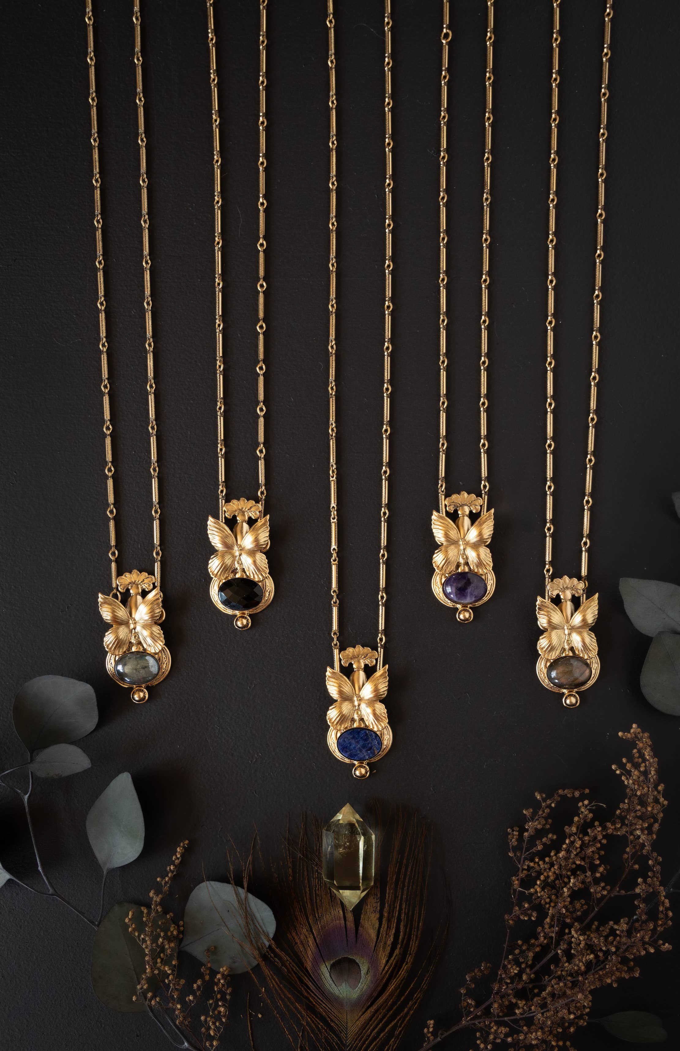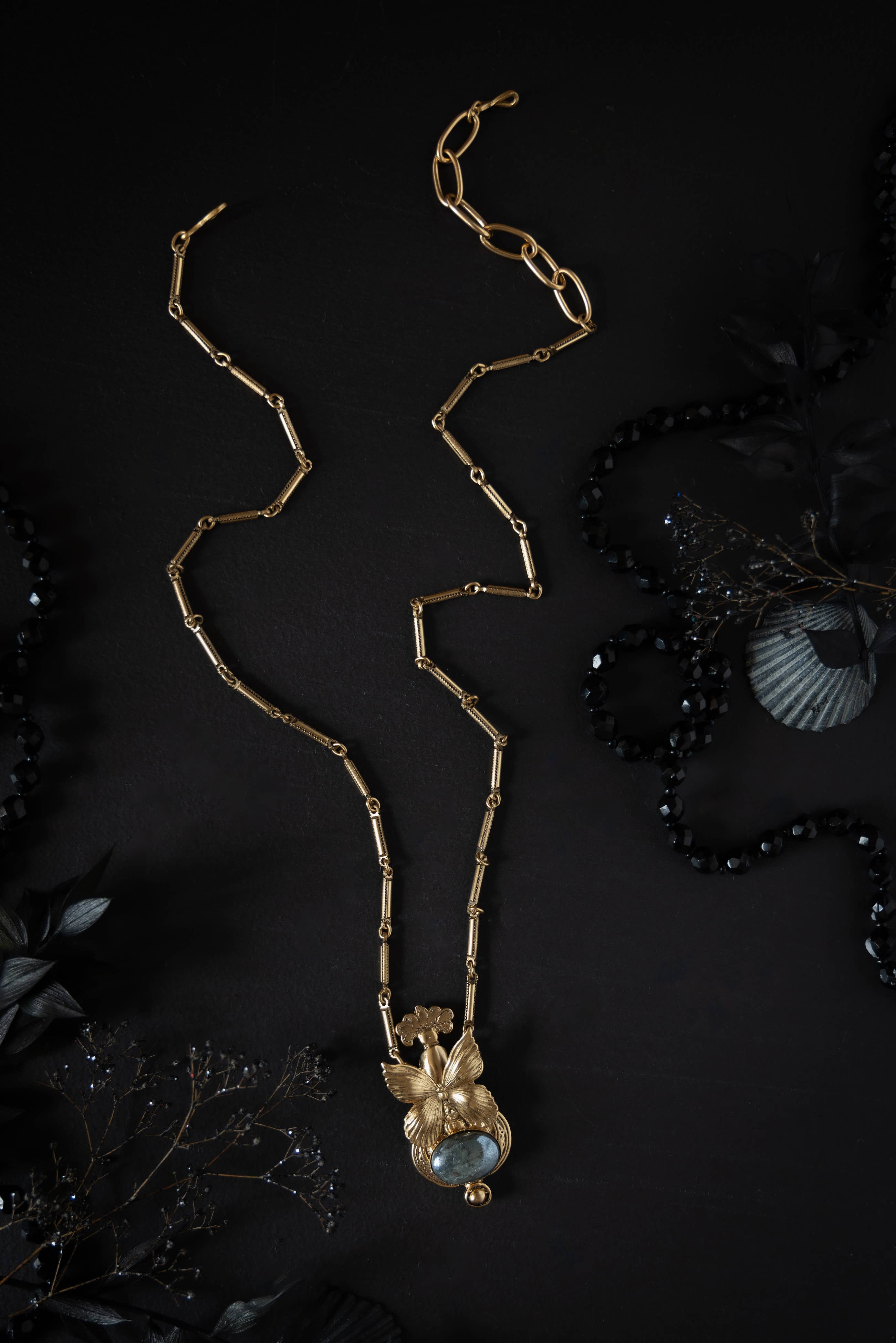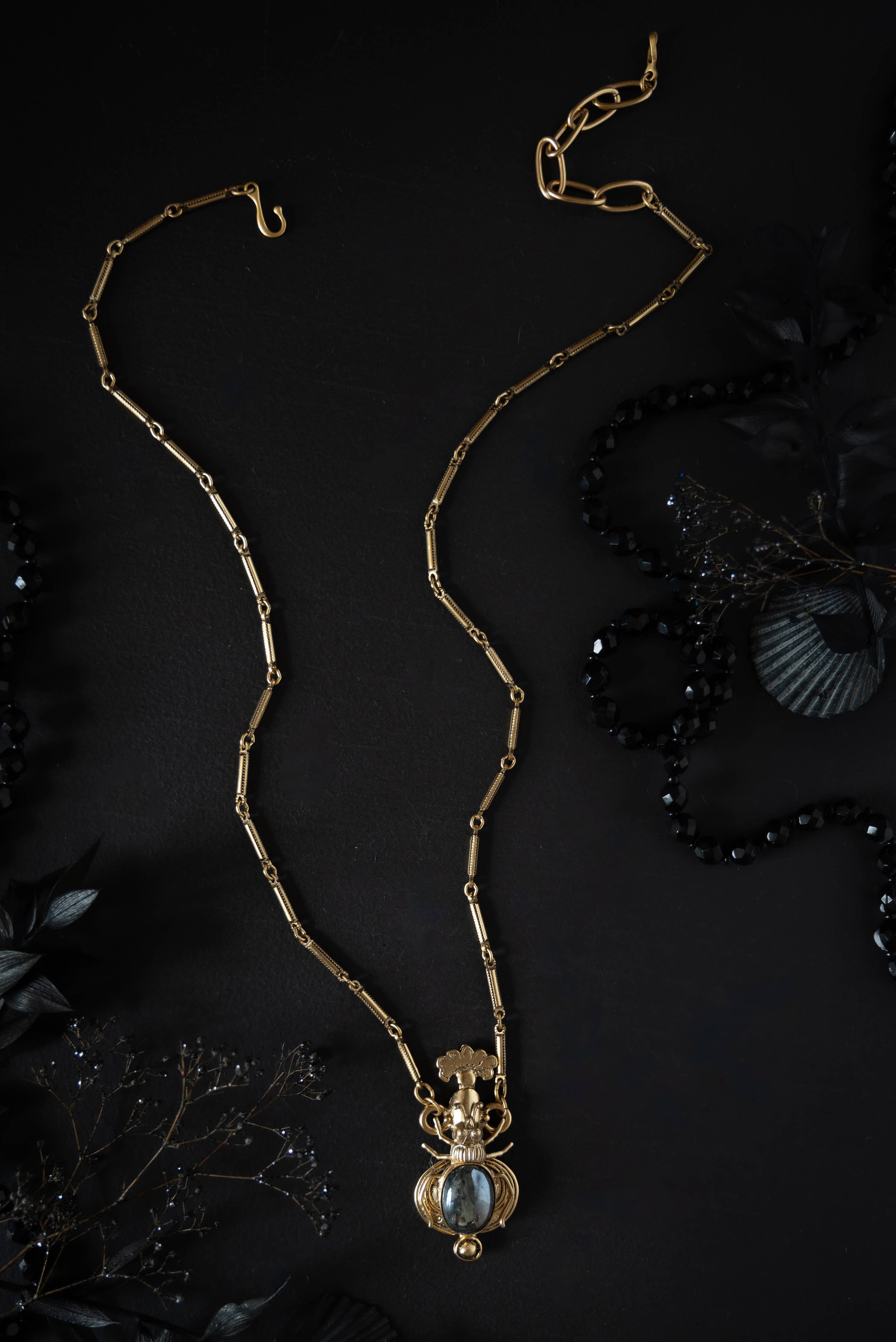 Neckline: 22” with 3” adjuster Pendant, 2.25” -Bronze casting with antique gold overlay -Tooled brass charms with antique gold overlay -Brass chain with antique gold overlay -Gemstone