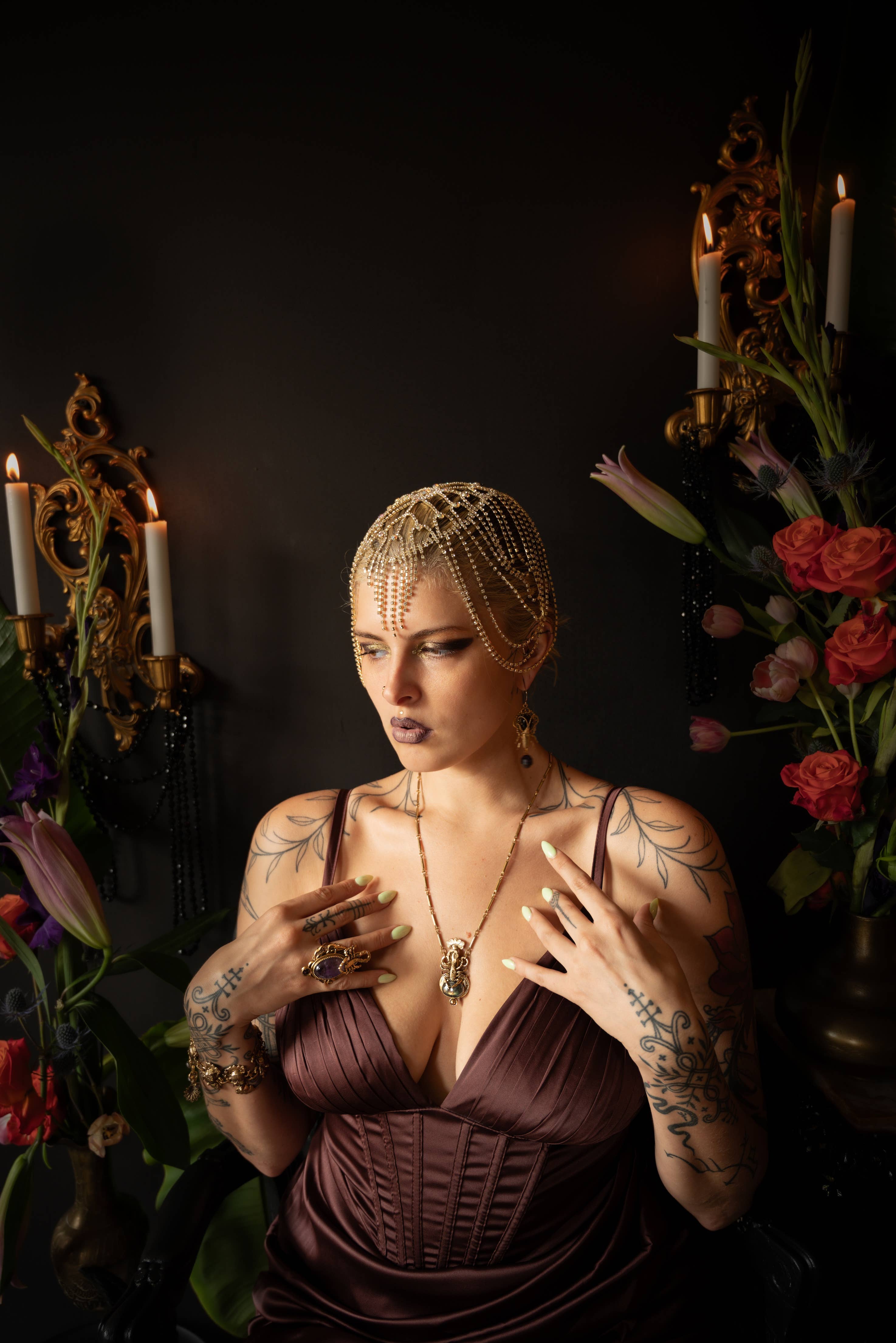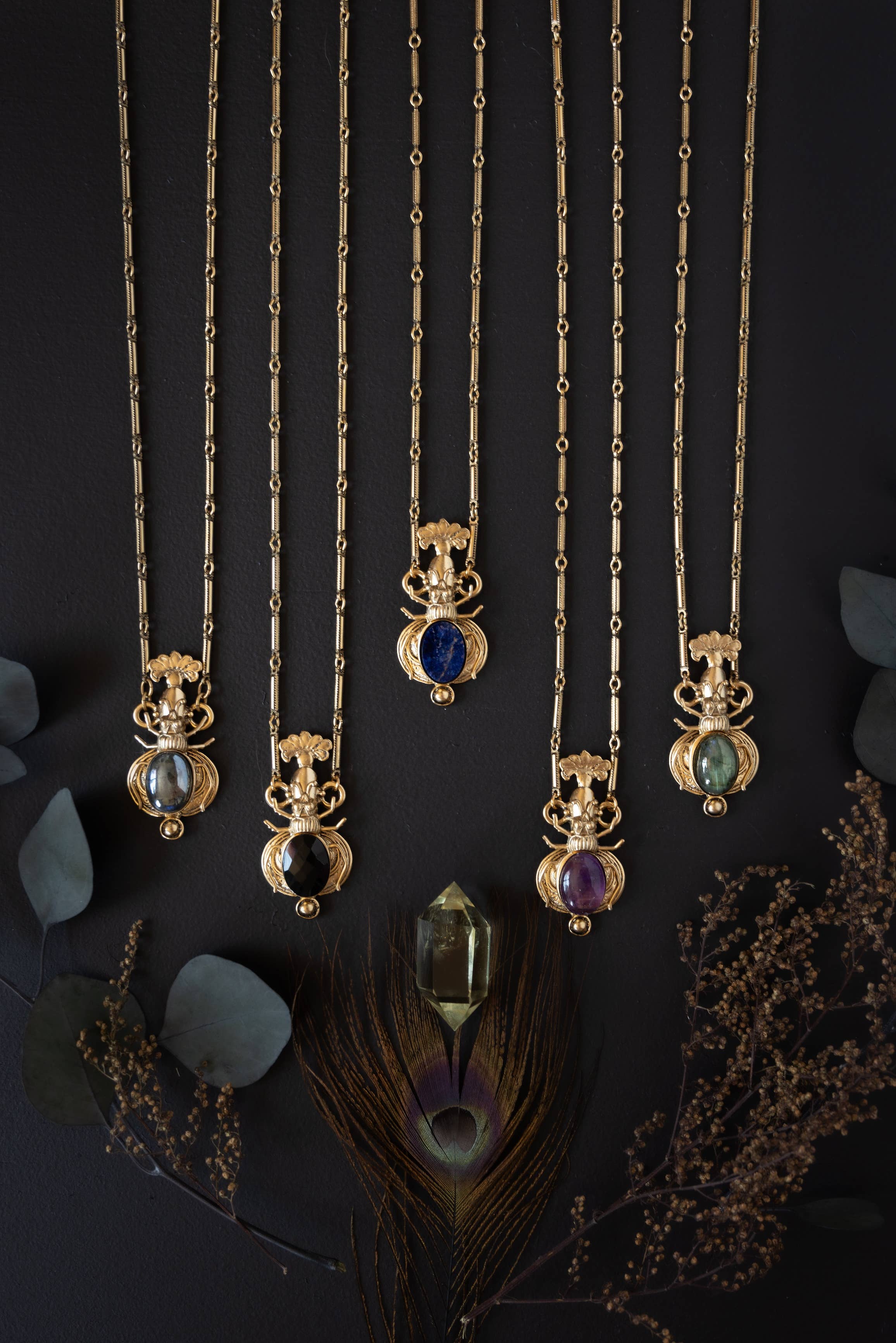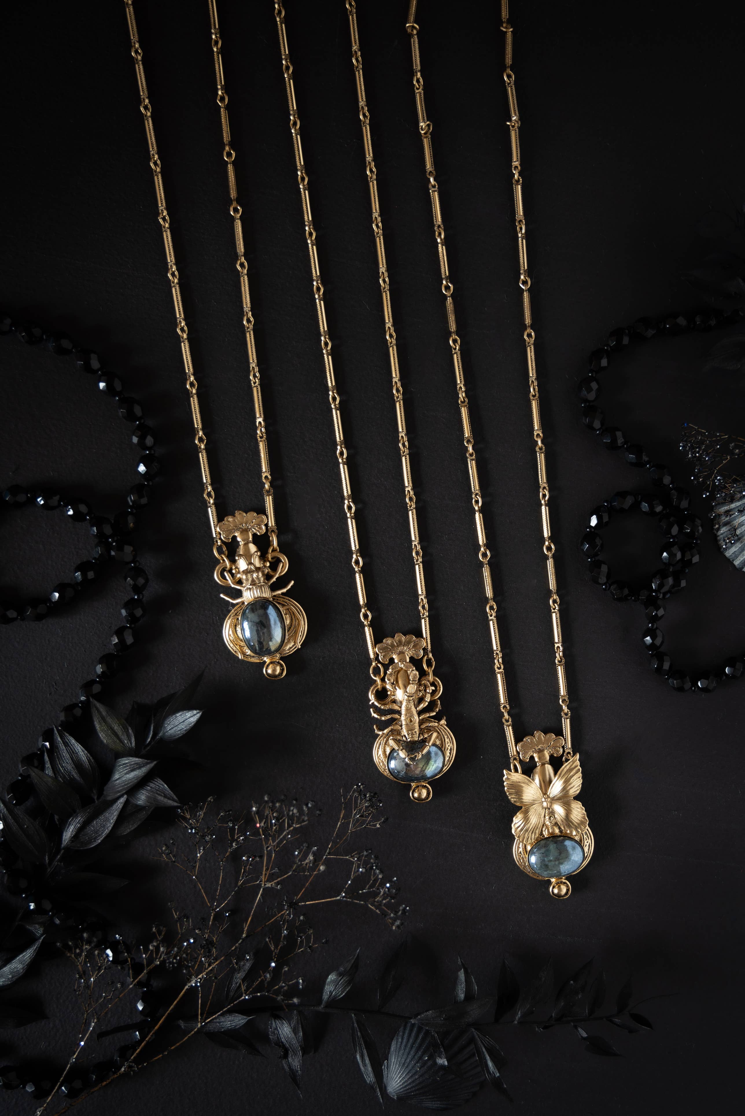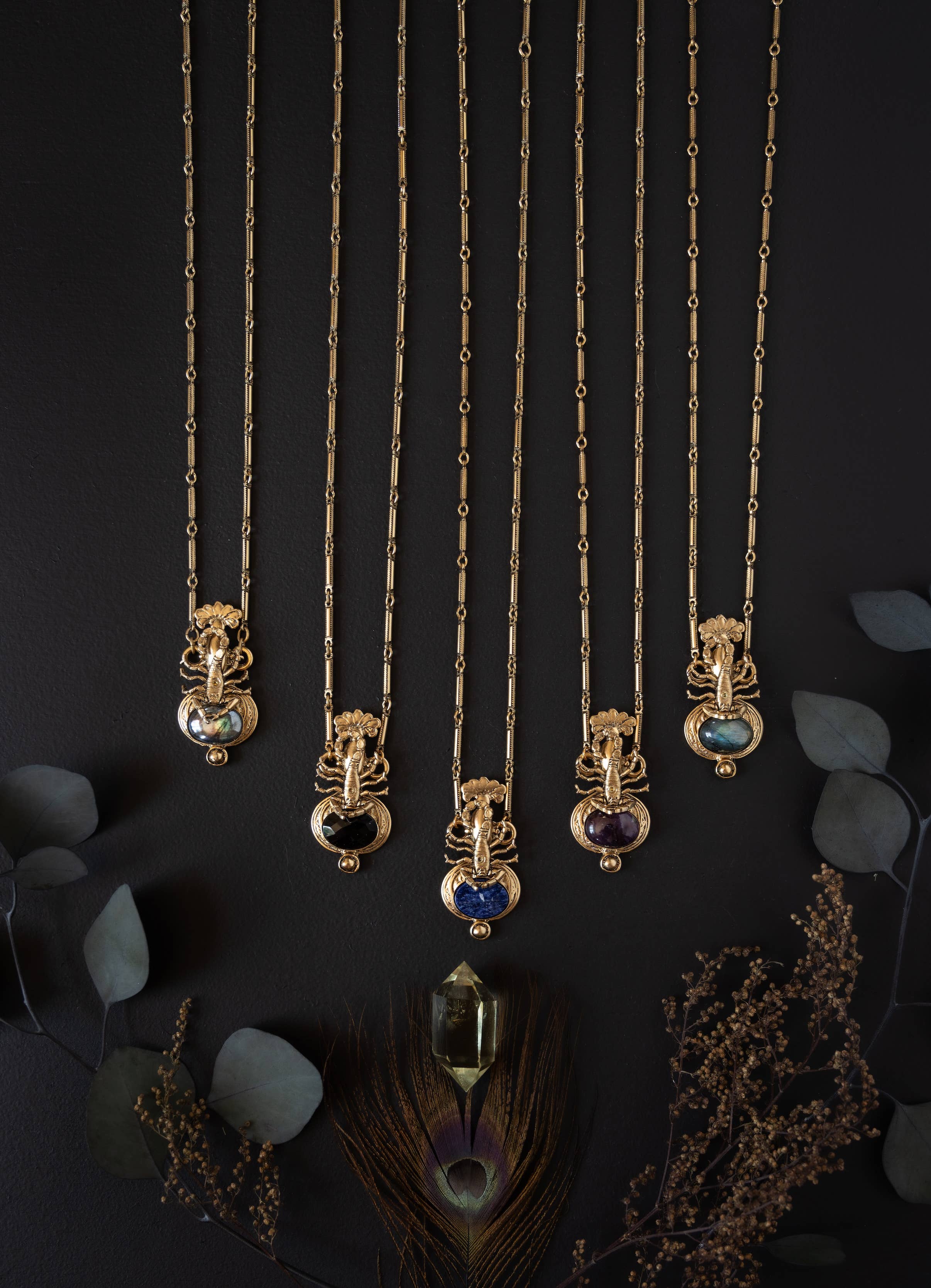 Gemstone cabochons framed by a scorpion, beetle or butterfly guardian that sit on a Byzantine style fan.