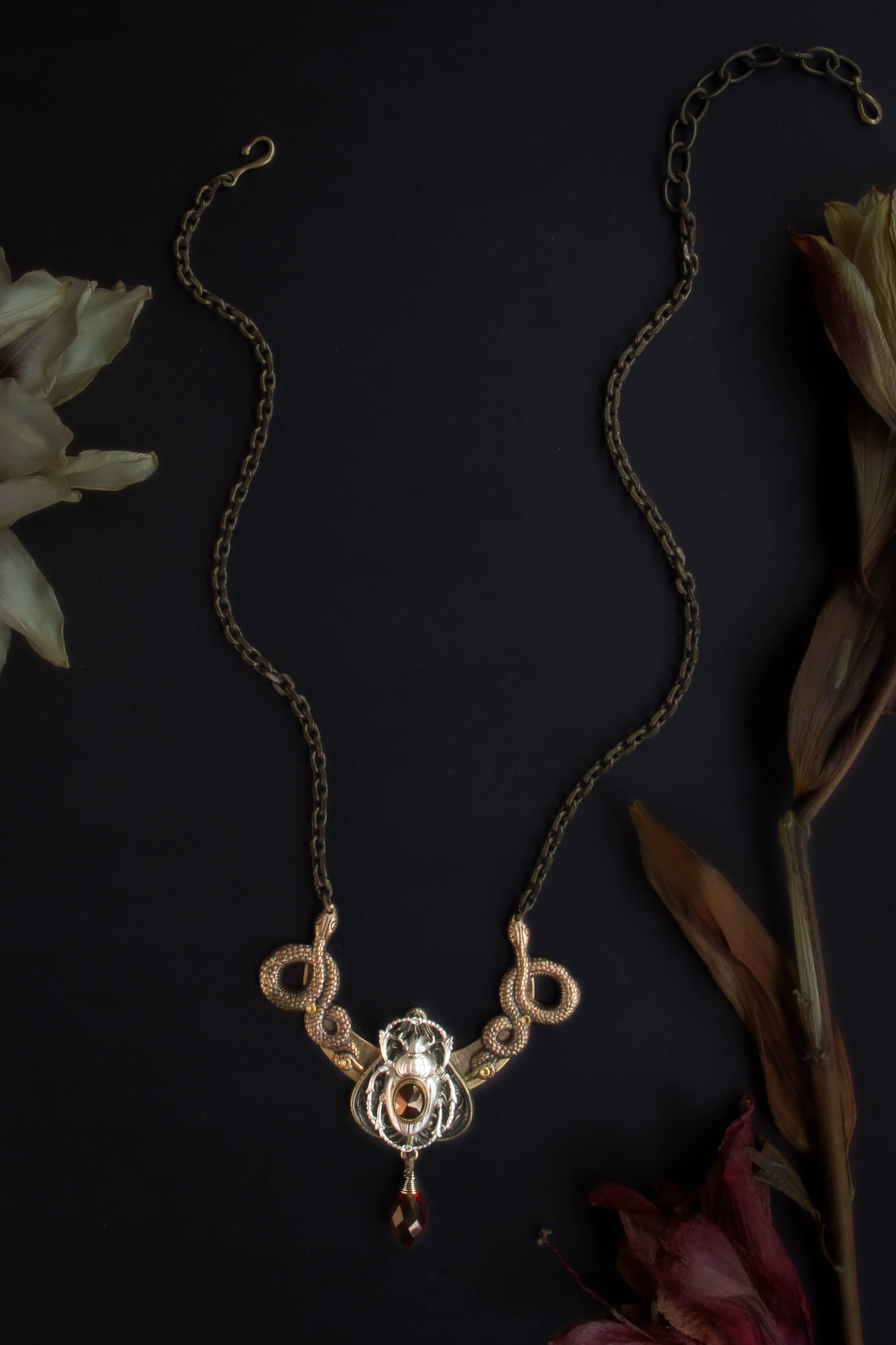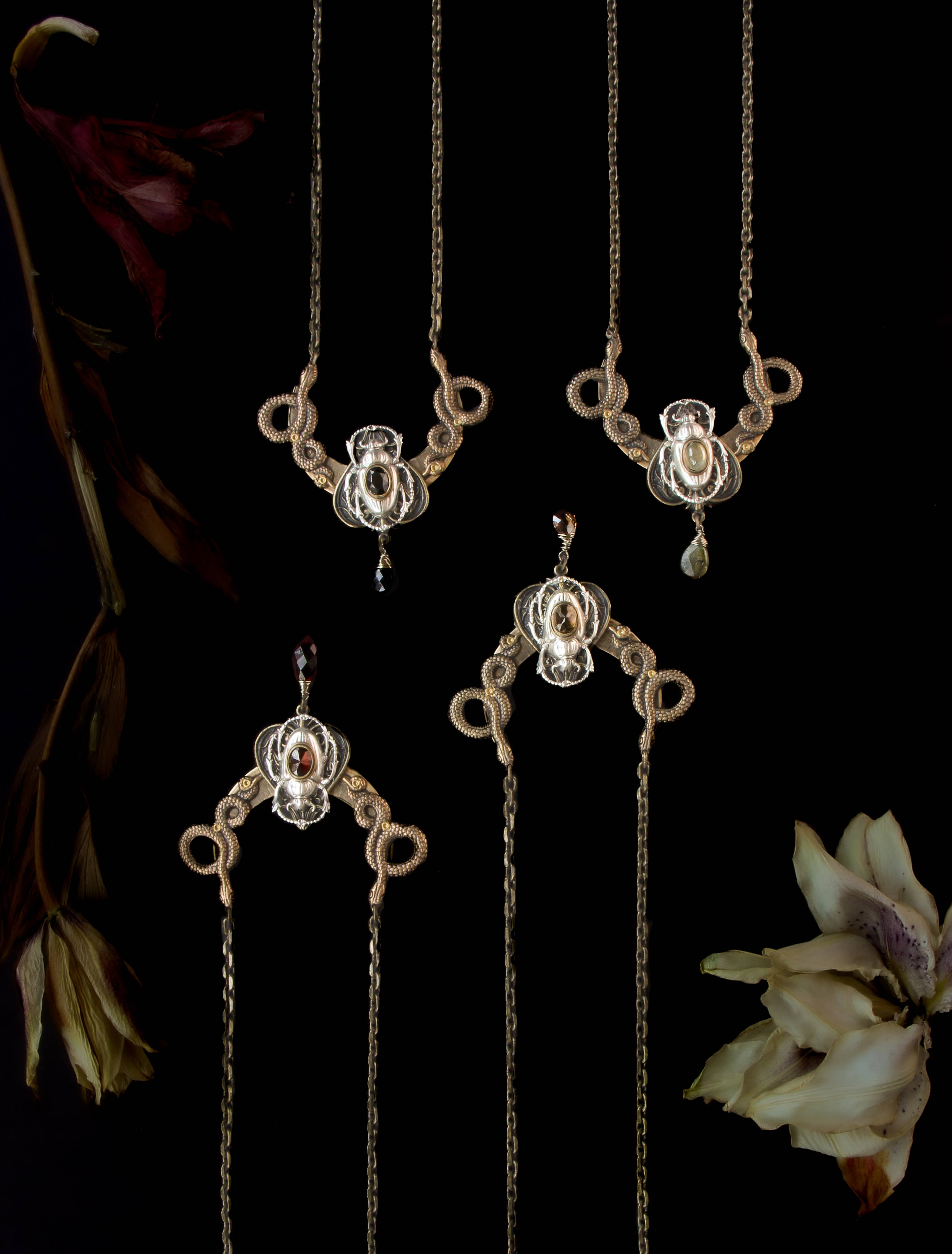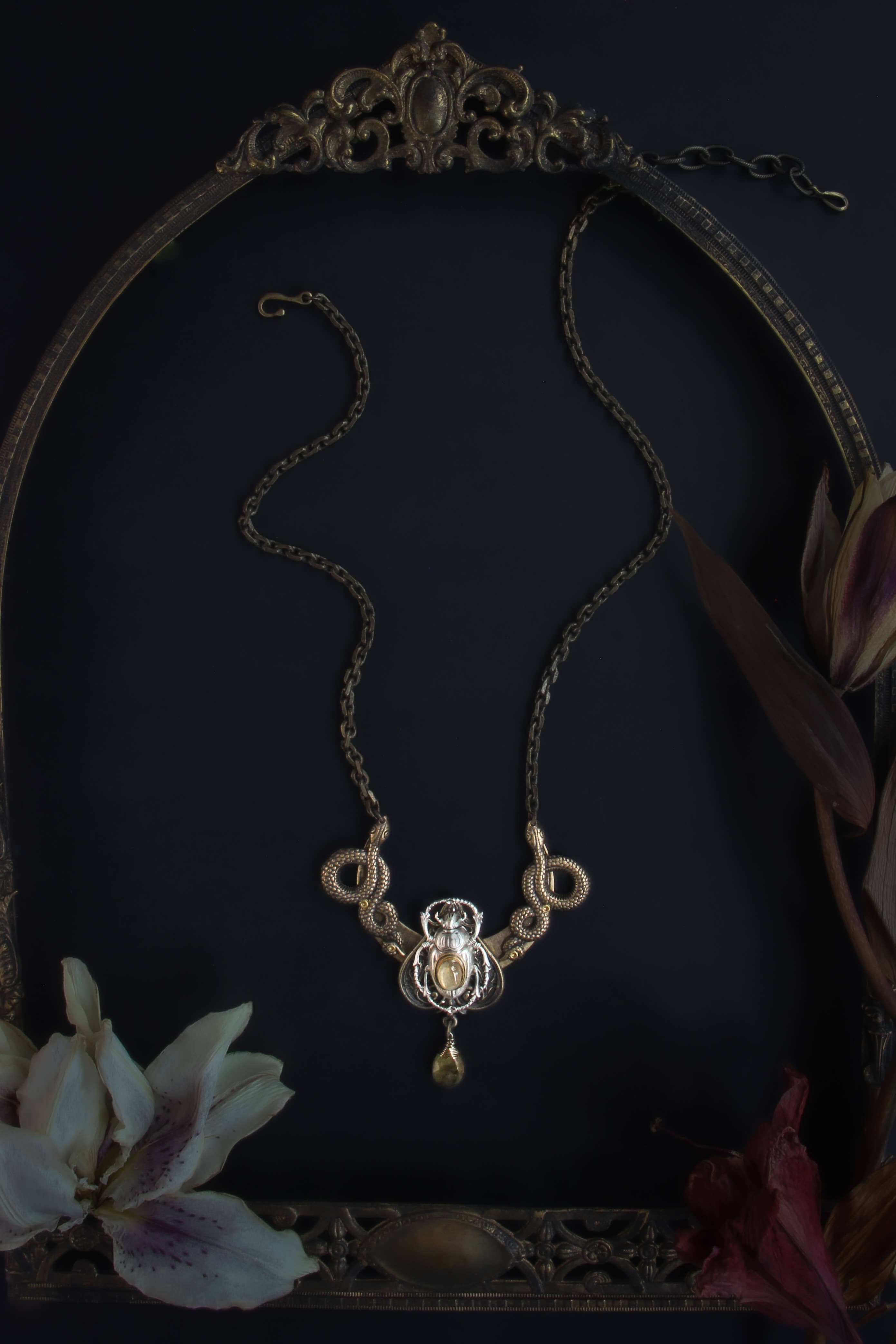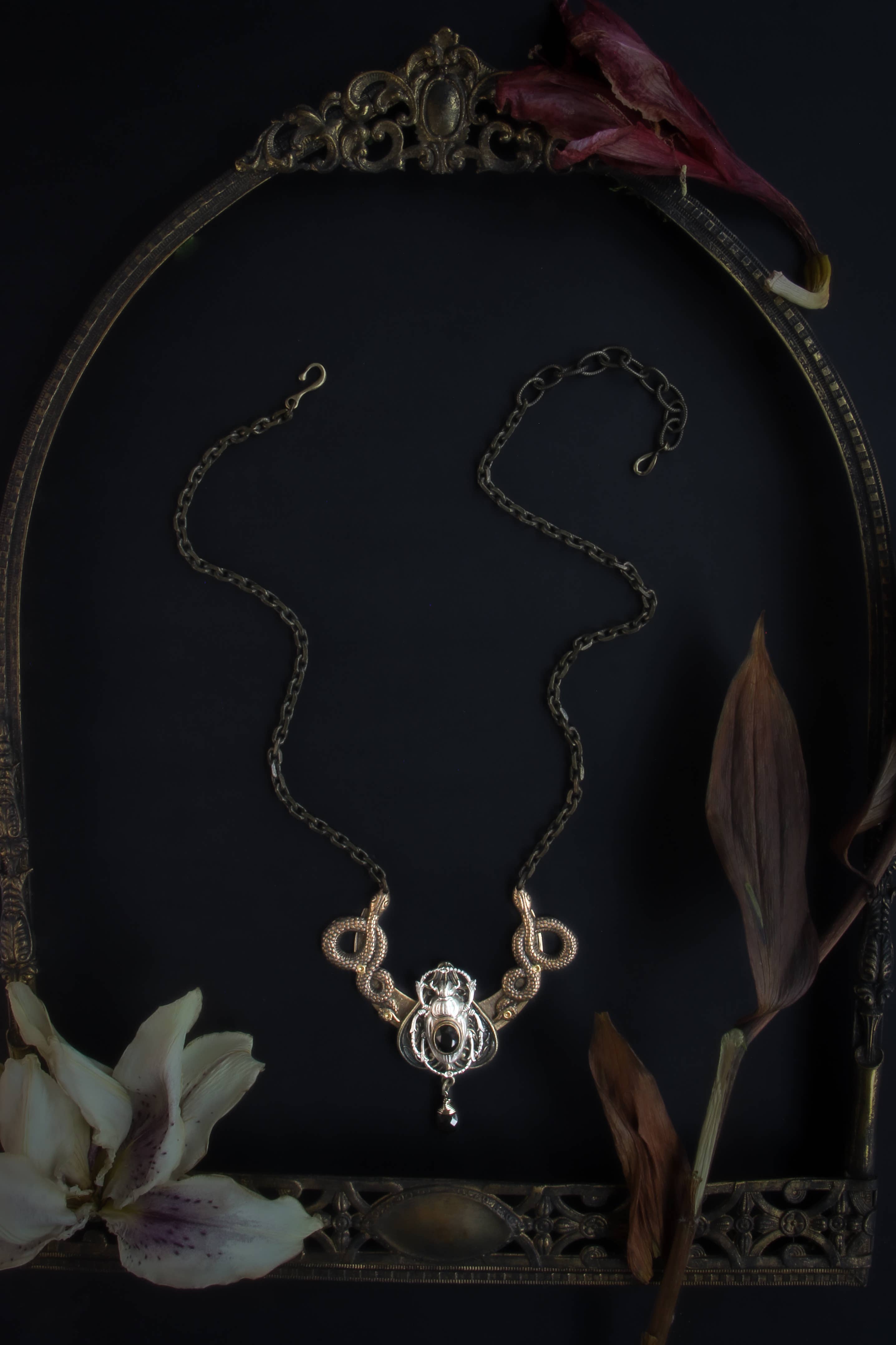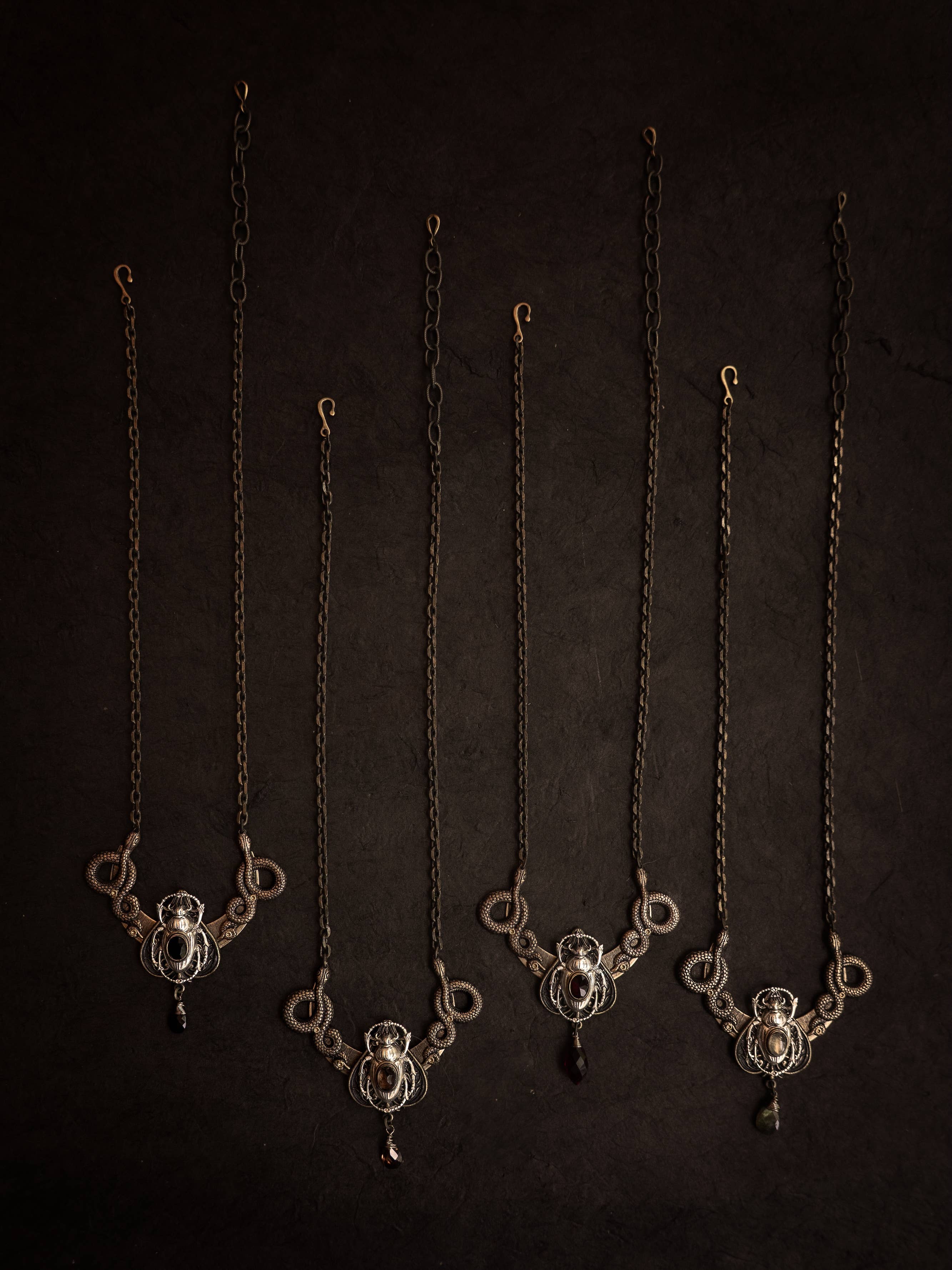 Neckline, 16” with 3” adjuster Pendant, 3” with drop -Tooled brass, cast pewter with antique finish -Gemstone cabochon -Gemstone and crystal drop -Steel and brass chain with brass antique finish