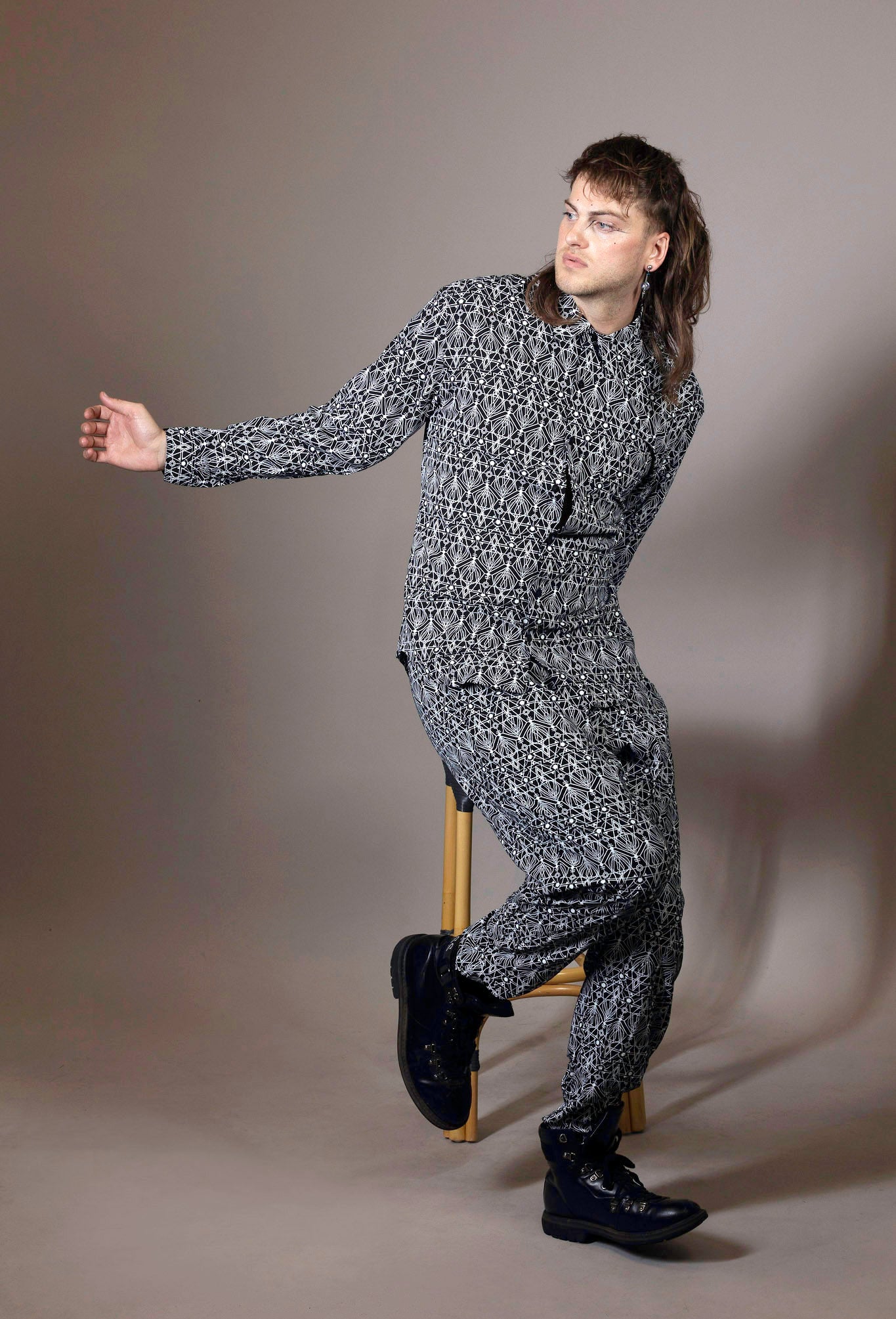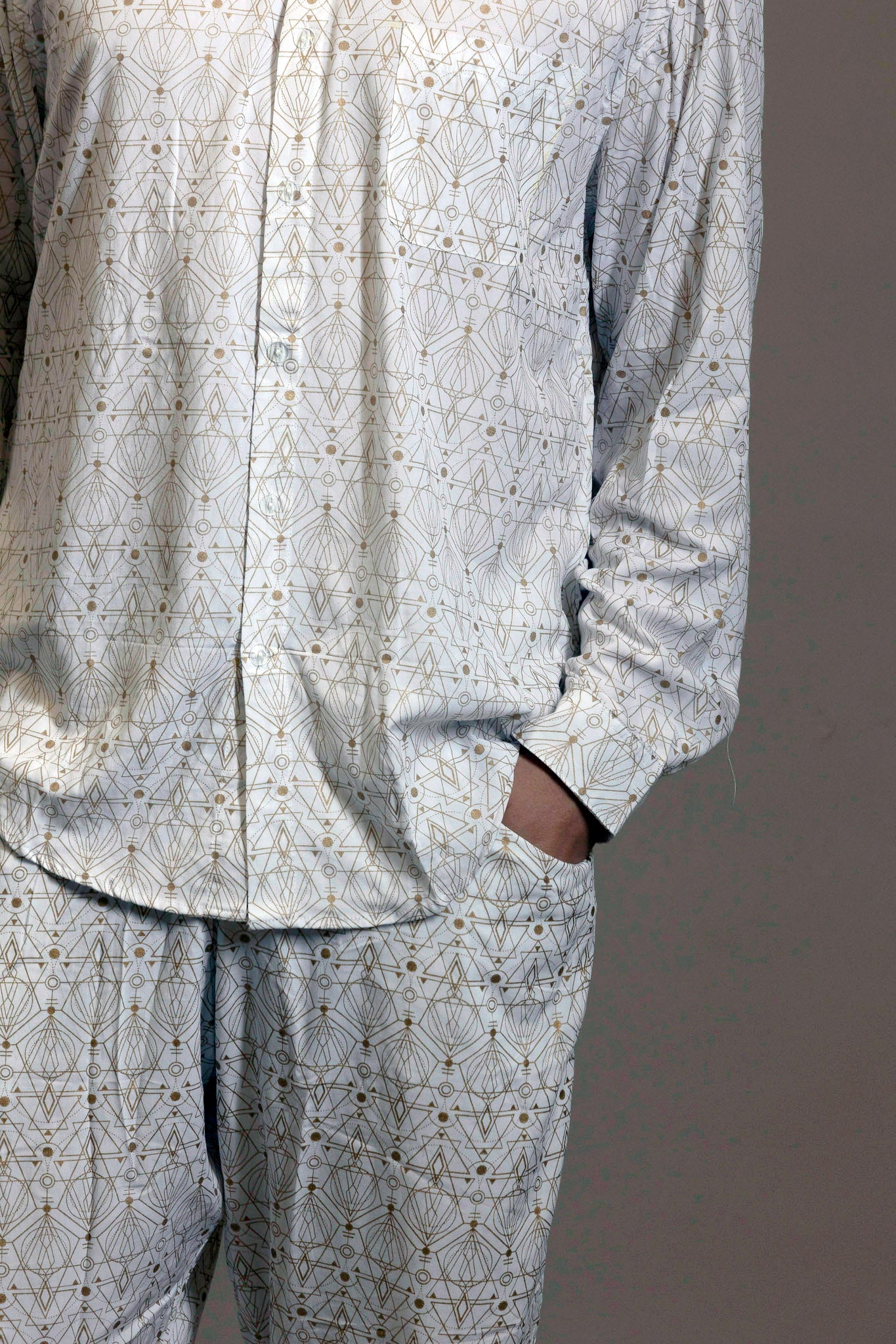 The structured button-front cut channels timeless cool while the intricate geometric pattern speaks originality.