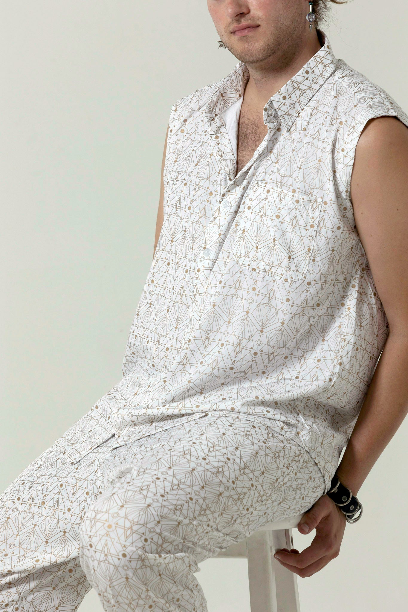 Elevate your streetwear collection with our Nova Print Button Front Sleeveless Shirt, featuring an exclusive geometric design that captures contemporary urban aesthetics.