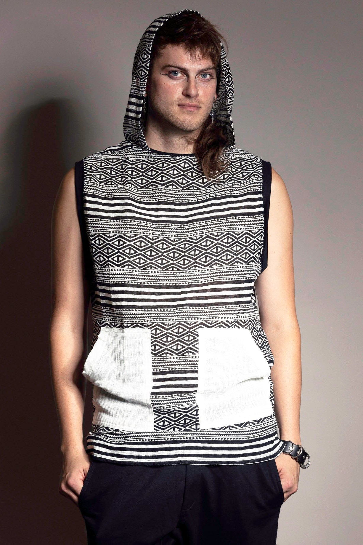 Unleash your beach vibe with the MizMoZ Hooded Tank Block Print. Made with 100% cotton mesh and hand printed for a unique touch, this tank features a hood and patch pockets for convenience. Perfect for summer adventures in Tulum or wherever the sun takes you.