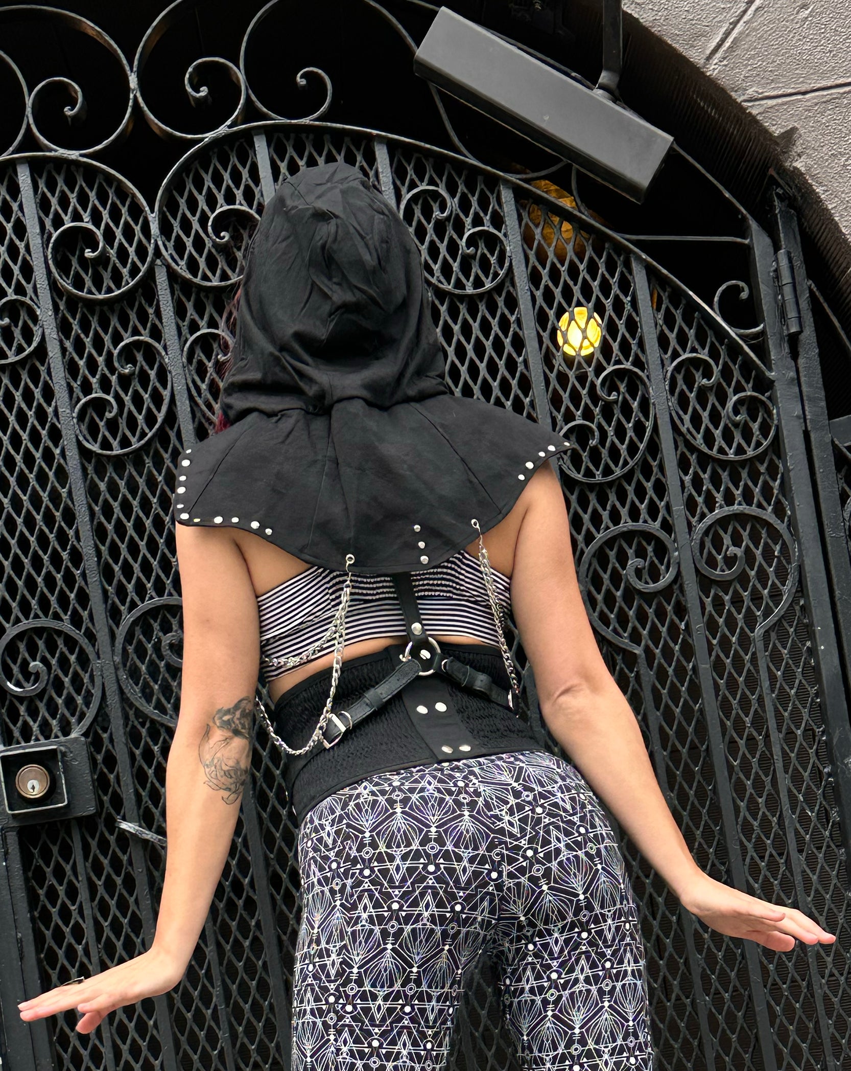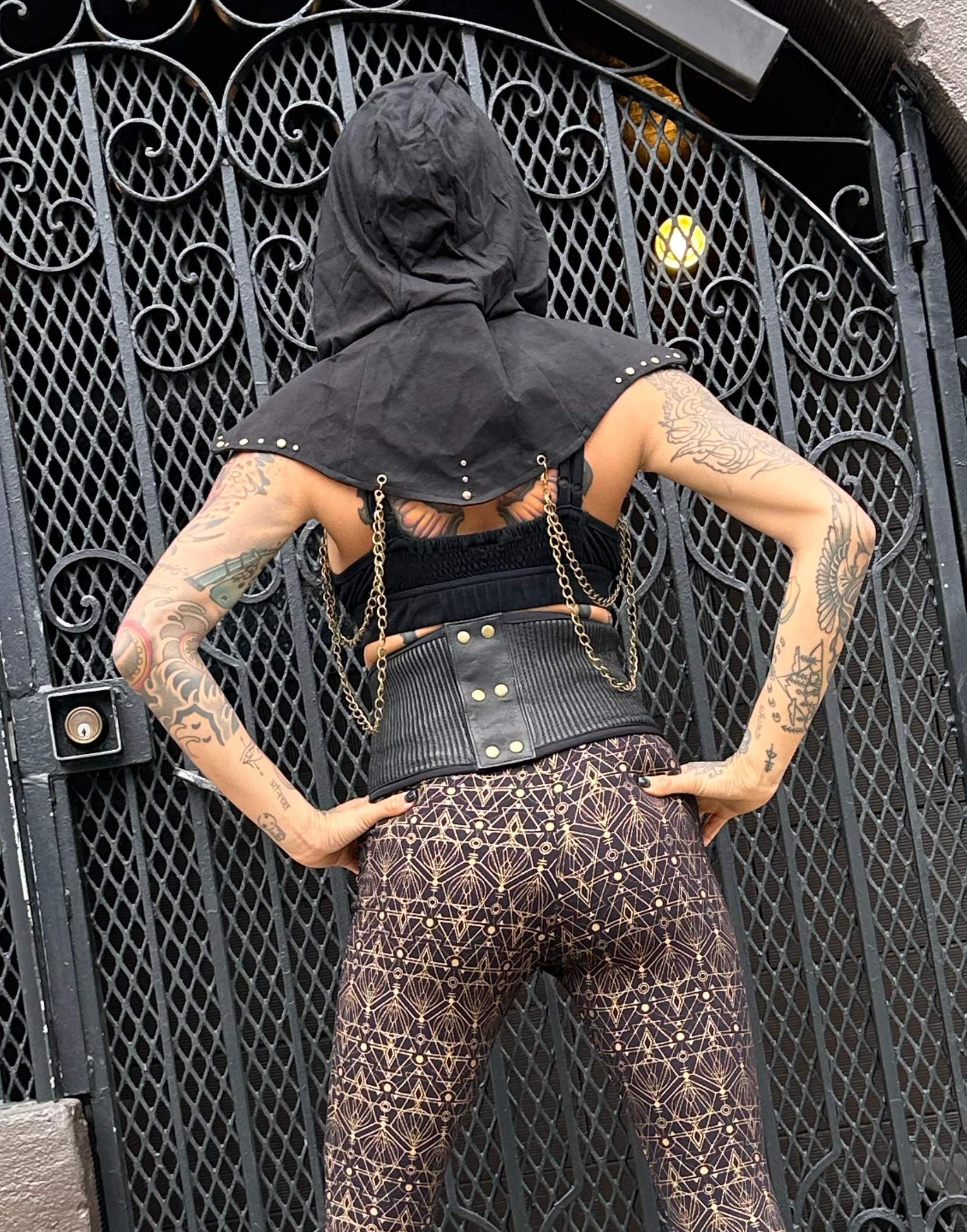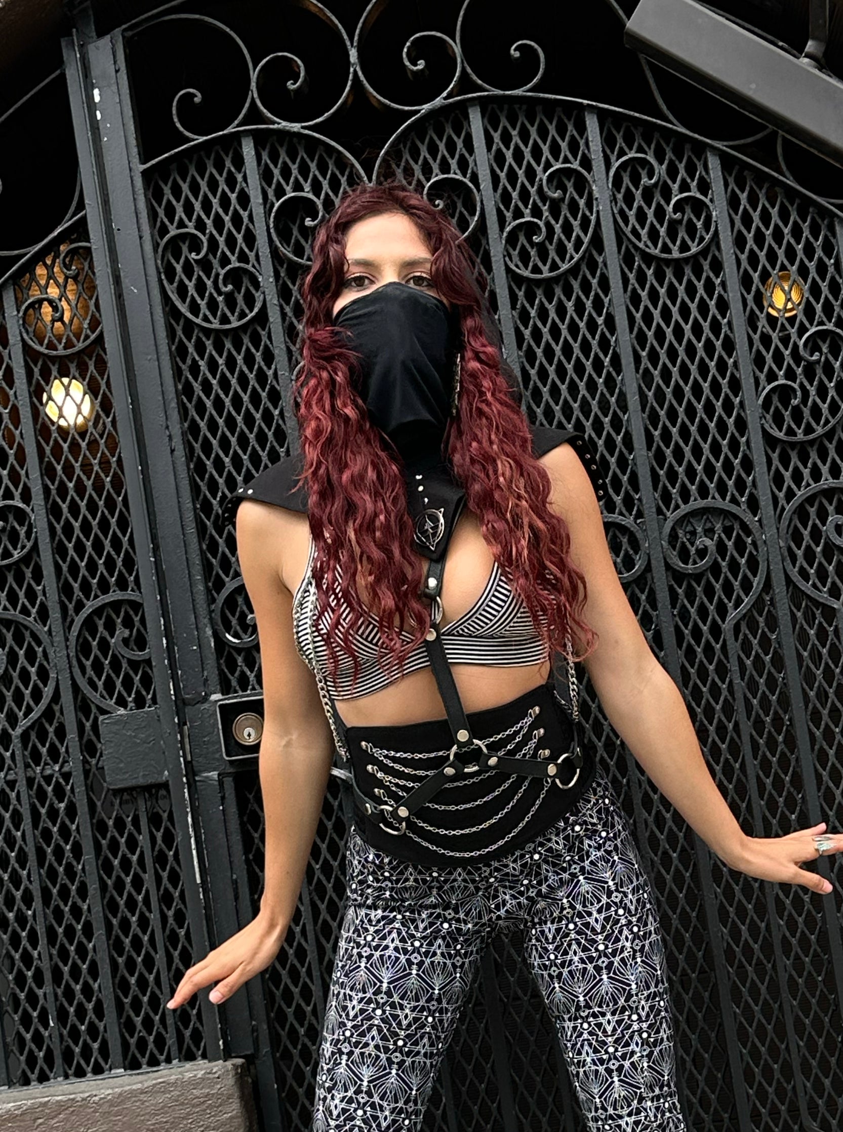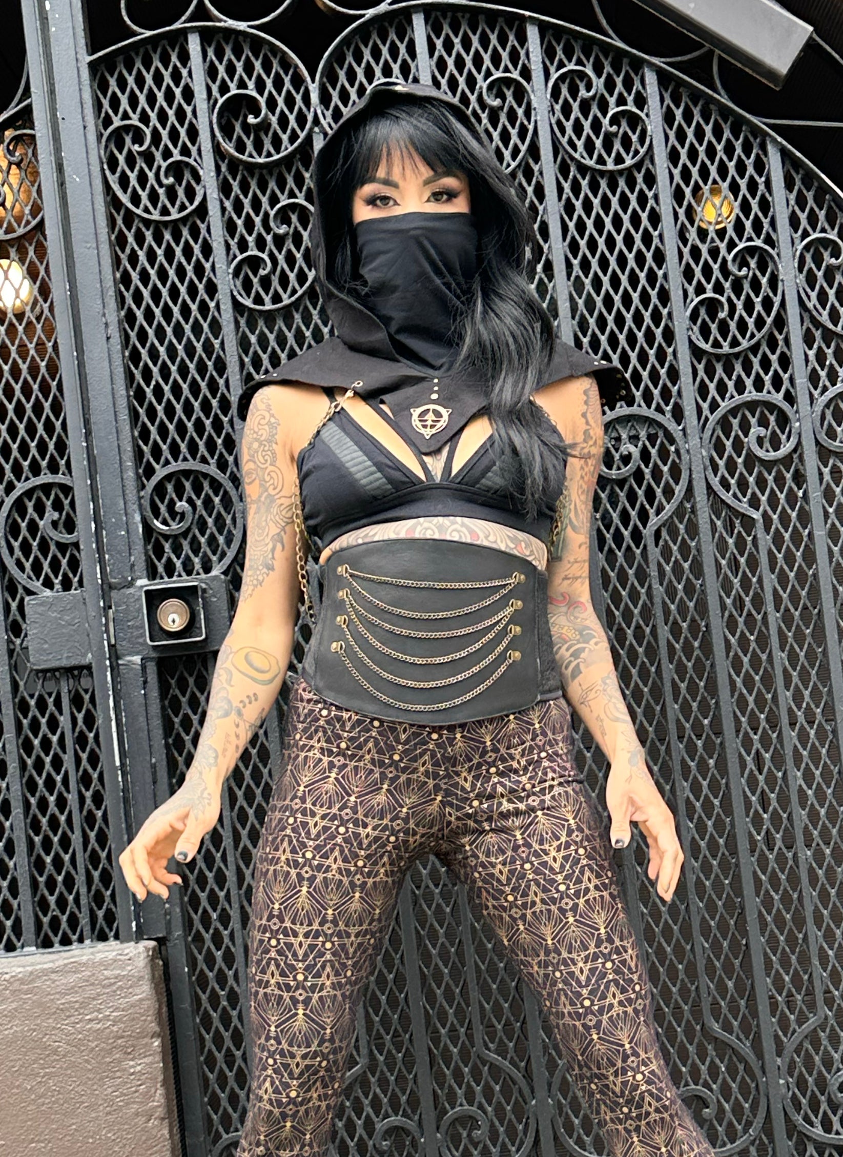 Unleash your warrior spirit with the Samurai Hooded Vest. This edgy harness combines Chains, a futuristic design, Mask, and a post-apocalyptic vibe.