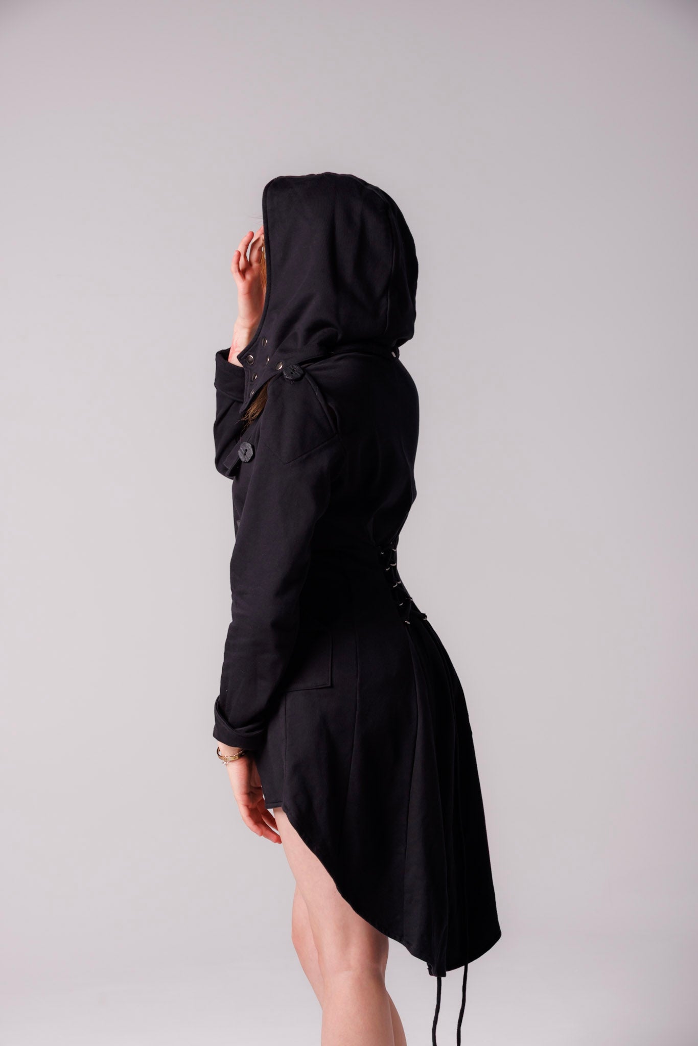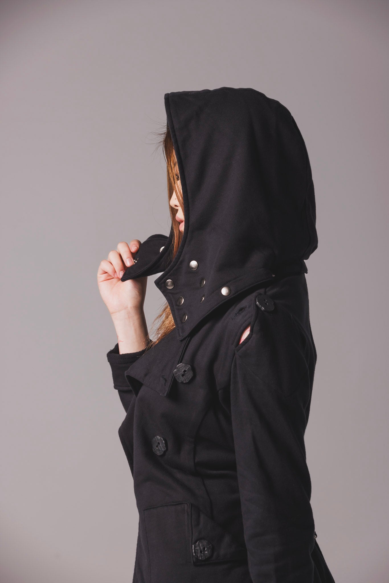 Unisex Kayo Anime Trench Coat with detachable hood, a-line design, and large dramatic buttons.